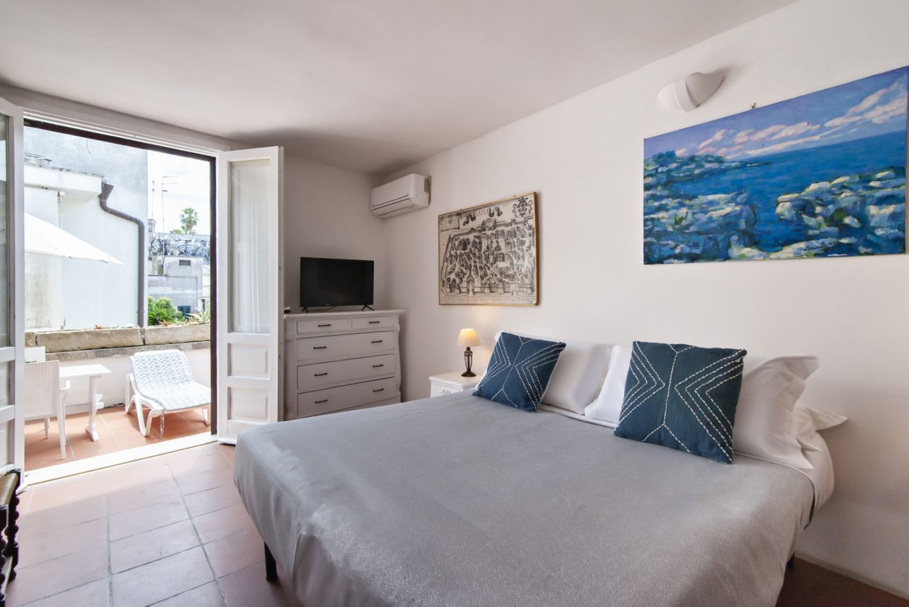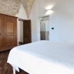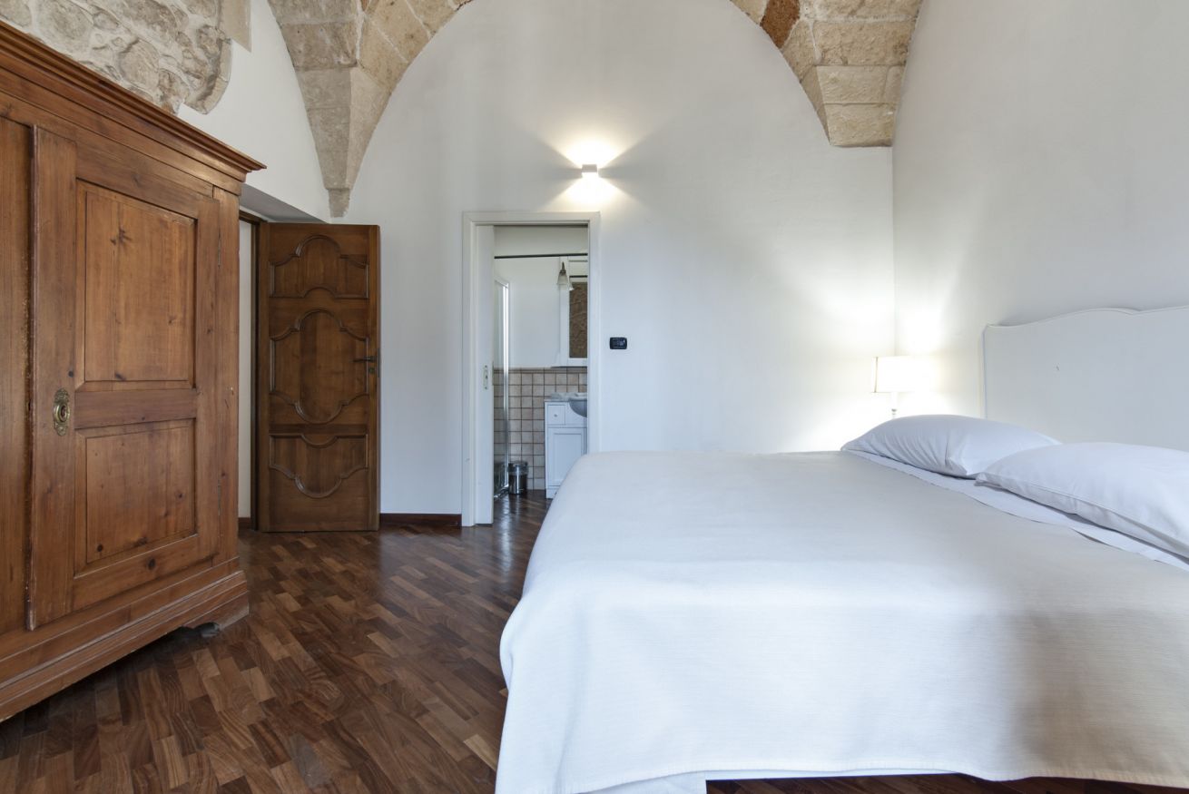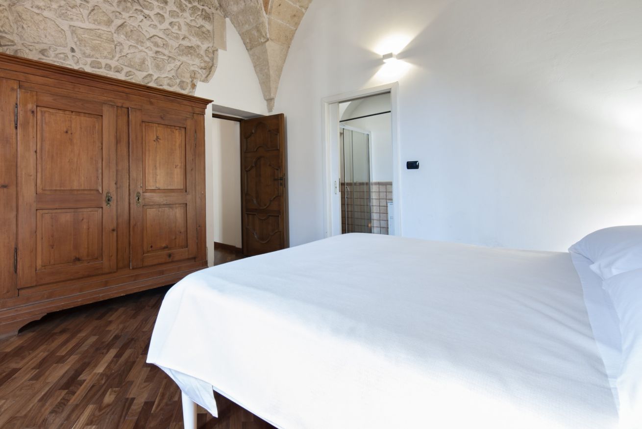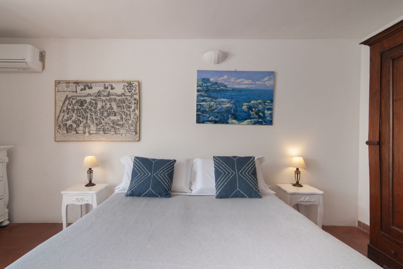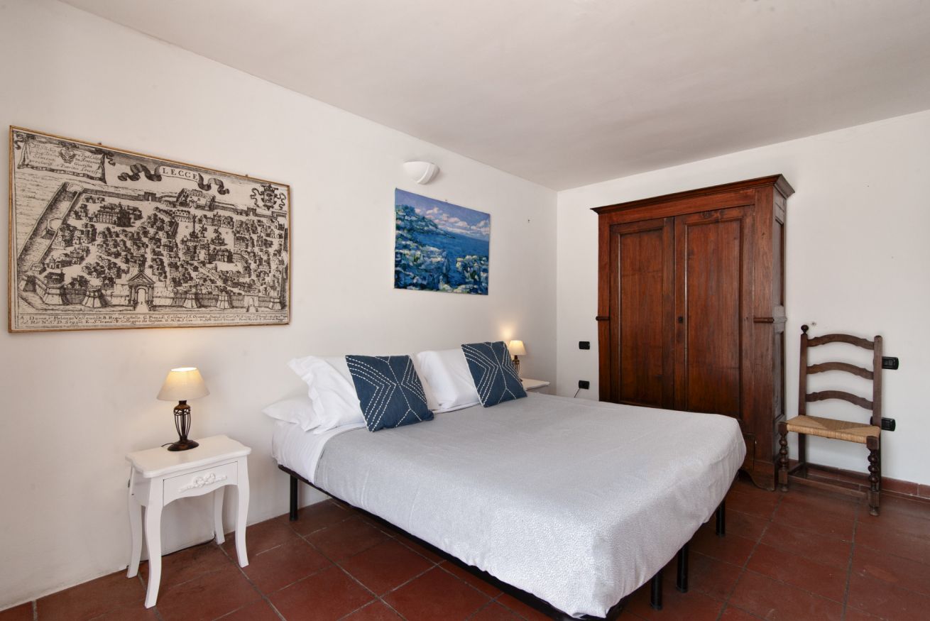 La camera matrimoniale, ampia e luminosa, è arredata con gusto semplice e dettagli che richiamano la tradizione salentina: pavimenti in cotto, arredi in legno e decorazioni dallo stile mediterraneo.