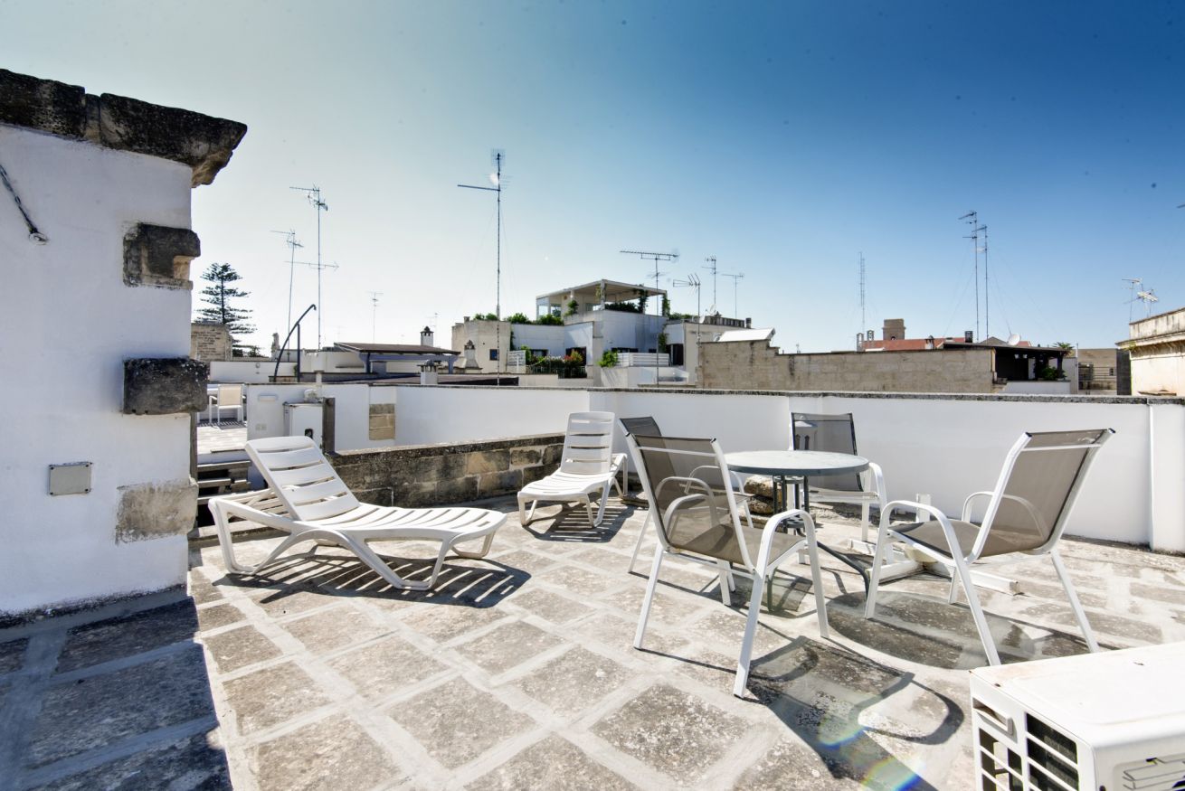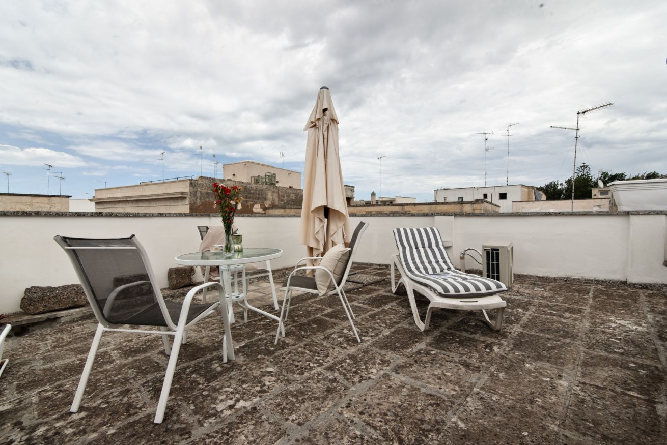 - Terrazza panoramica con solarium, arredata con sdraio e sedie, dove ammirare tramonti mozzafiato sulla piazza e vivere momenti di puro relax all’aperto.