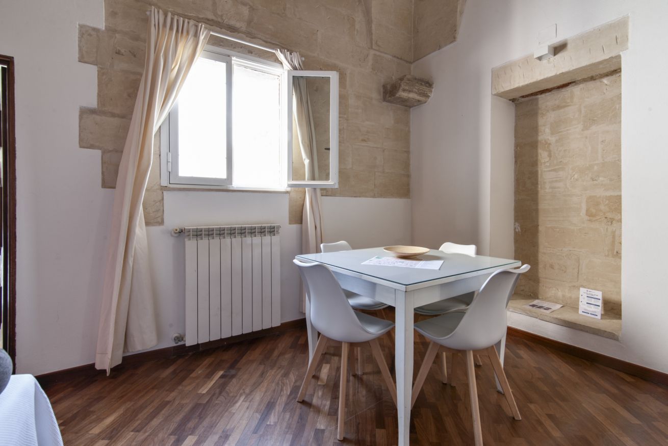 L’ambiente è luminoso grazie all’ampia vetrata che affaccia su un angolo caratteristico della corte interna, perfetto per chi cerca silenzio e relax pur restando a pochi passi da monumenti come la Basilica di Santa Croce e Piazza Sant’Oronzo.