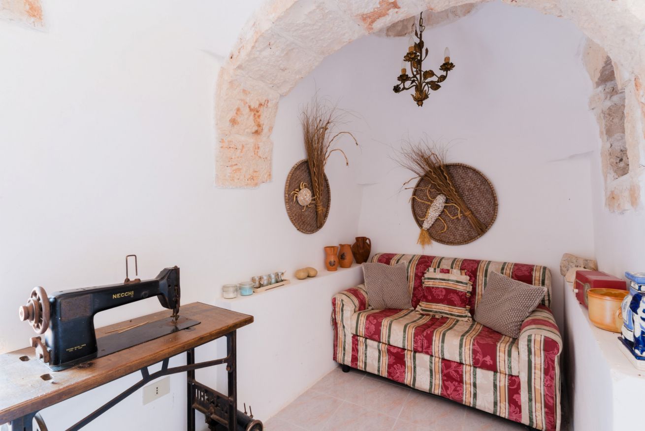 Gli interni mantengono il carattere autentico del trullo, con pietra a vista e ambienti accoglienti.