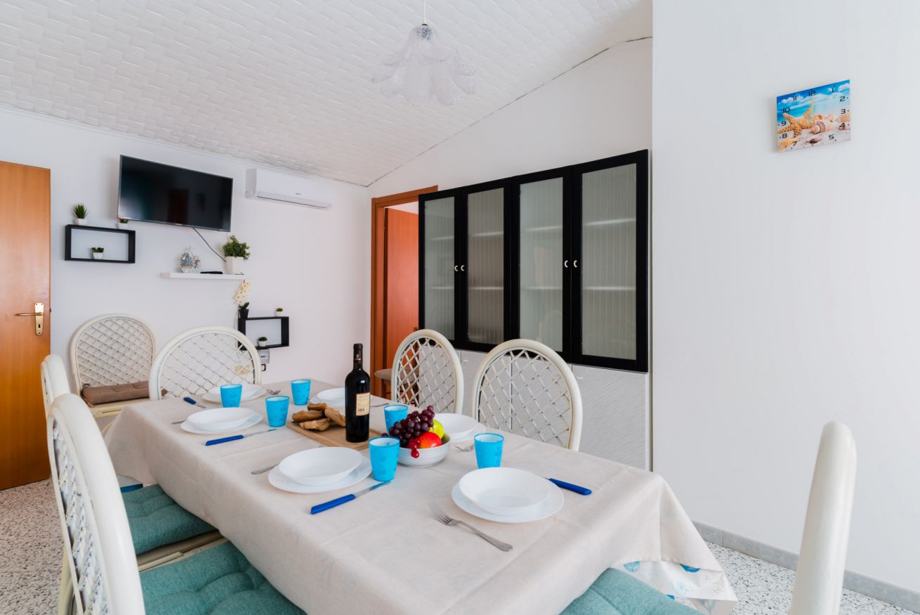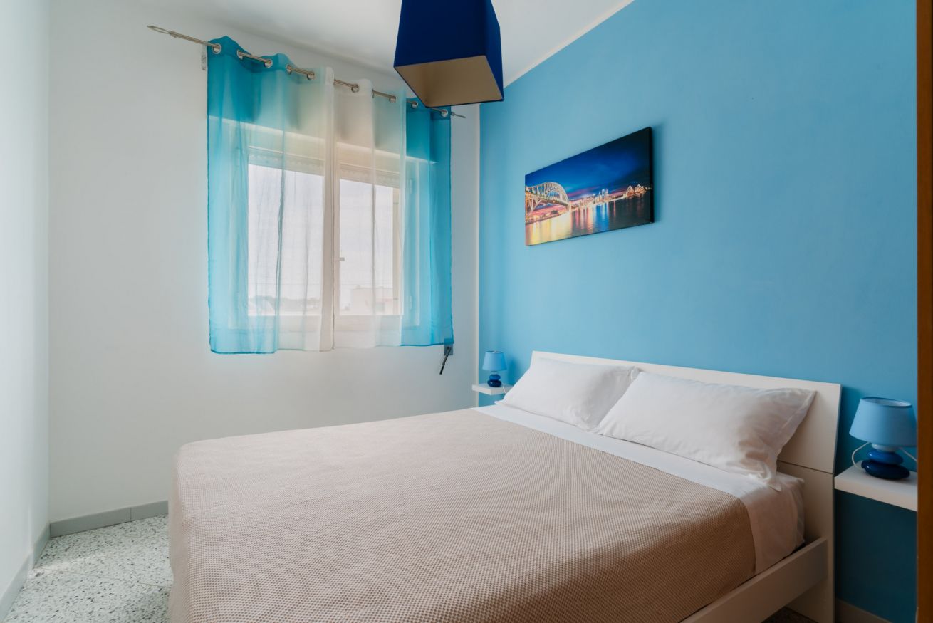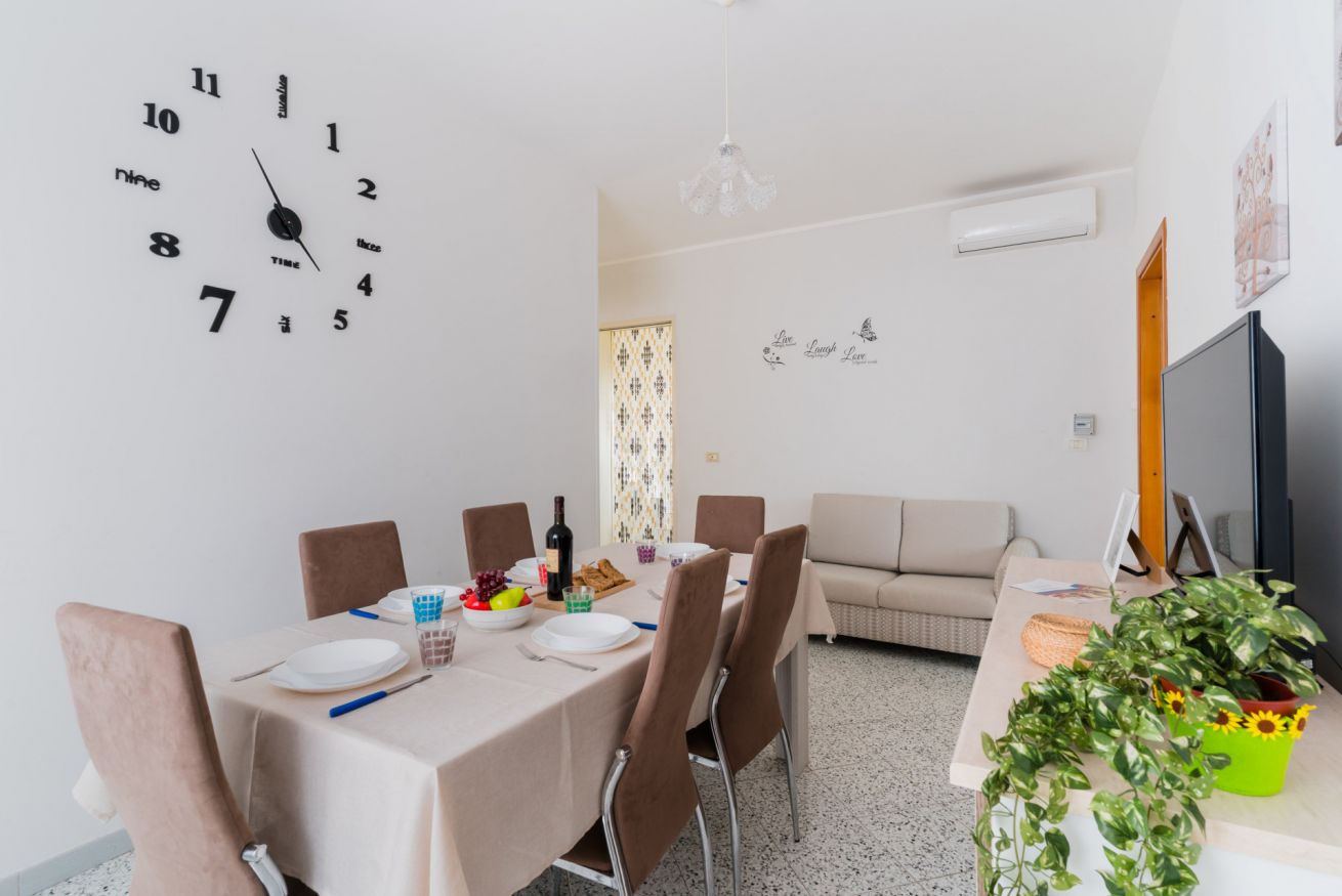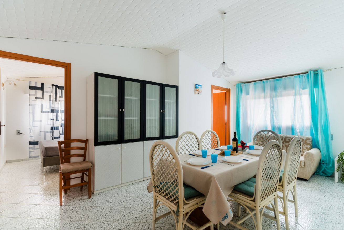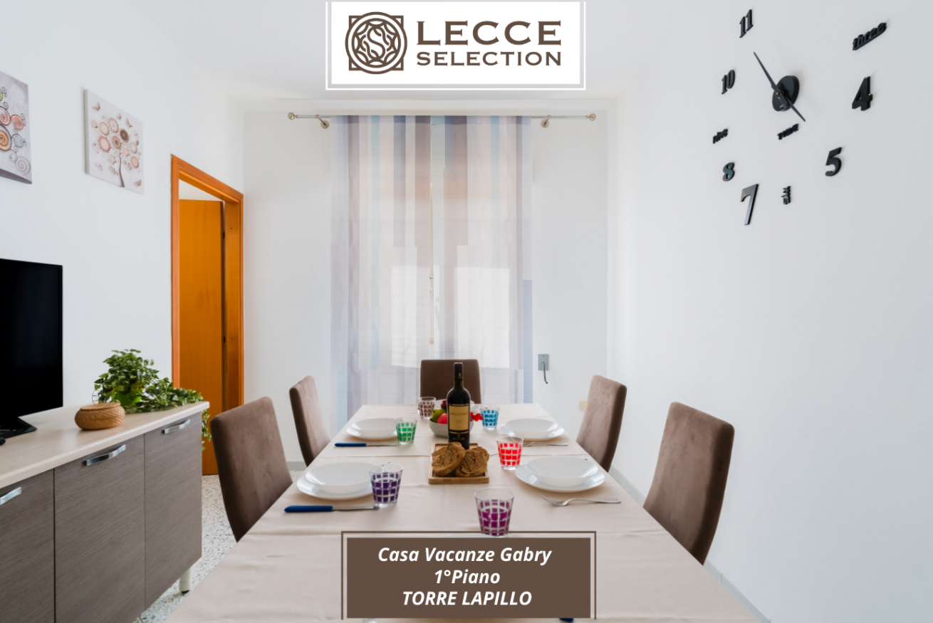 Casa Vacanza Gabry 1° Piano, situata a Torre Lapillo, ideale per famiglie o gruppi che cercano una soluzione pratica e funzionale a pochi passi dal mare salentino.Zona Giorno e CucinaL'ingresso si apre su un ampio open space climatizzato, arredato con semplicità e gusto moderno.Soggiorno: Dispone di un comodo divano lineare, una TV a schermo piatto e un grande tavolo da pranzo perfetto per cene conviviali. Spicca sulla parete un originale orologio di design a muro.Cucina: La cucina è separata o parzialmente a vista, dotata di mobili in legno chiaro, fuochi a gas, forno elettrico e un frigorifero con congelatore. È completamente attrezzata per preparare i pasti in autonomia.Lavanderia: È presente un pratico vano tecnico con un grande lavatoio, molto utile per sciacquare costumi e teli mare al rientro dalla spiaggia.Zona NotteLa casa dispone di diverse camere da letto, ognuna caratterizzata da un tema cromatico differente:Camera Matrimoniale "Pink": Caratterizzata da un'ampia testiera in ferro battuto bianco e una decorazione floreale a parete dai toni rosa e lilla.Camera Matrimoniale "Blue": Una stanza luminosa con una parete d'accento azzurro intenso e arredi coordinati, che richiama i colori del mare.Camera Doppia: Arredata con due letti singoli, ideale per bambini o ragazzi, completa di armadio e comodino centrale.Il BagnoIl bagno è funzionale e presenta finiture classiche, dotato di:Box doccia angolare con cabina a soffietto.Sanitari completi (incluso bidet).Mobile lavabo moderno con cassetti e specchiera illuminata.