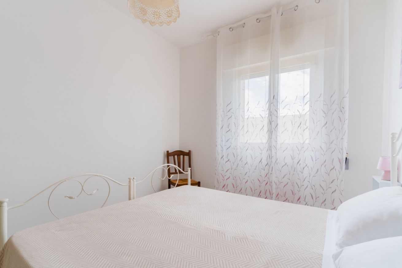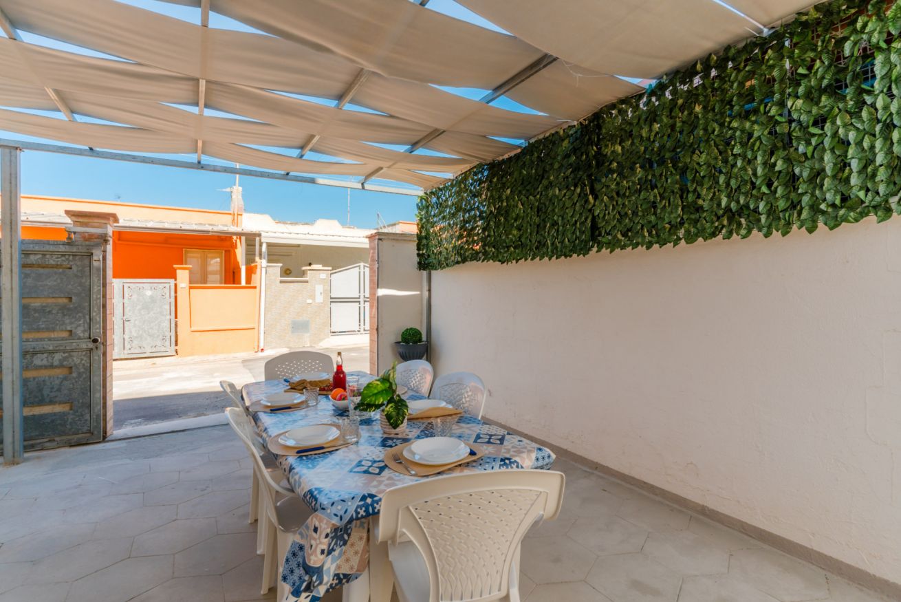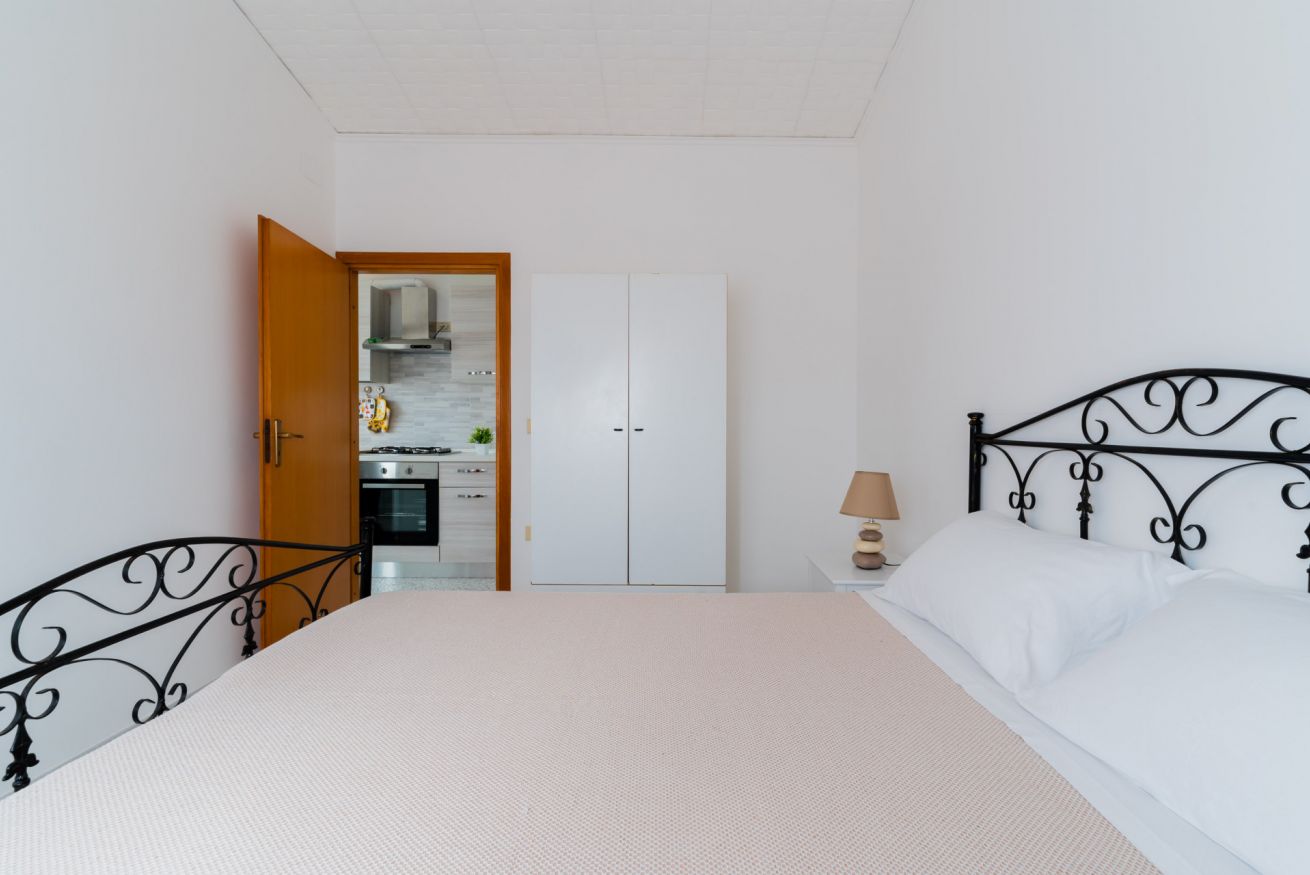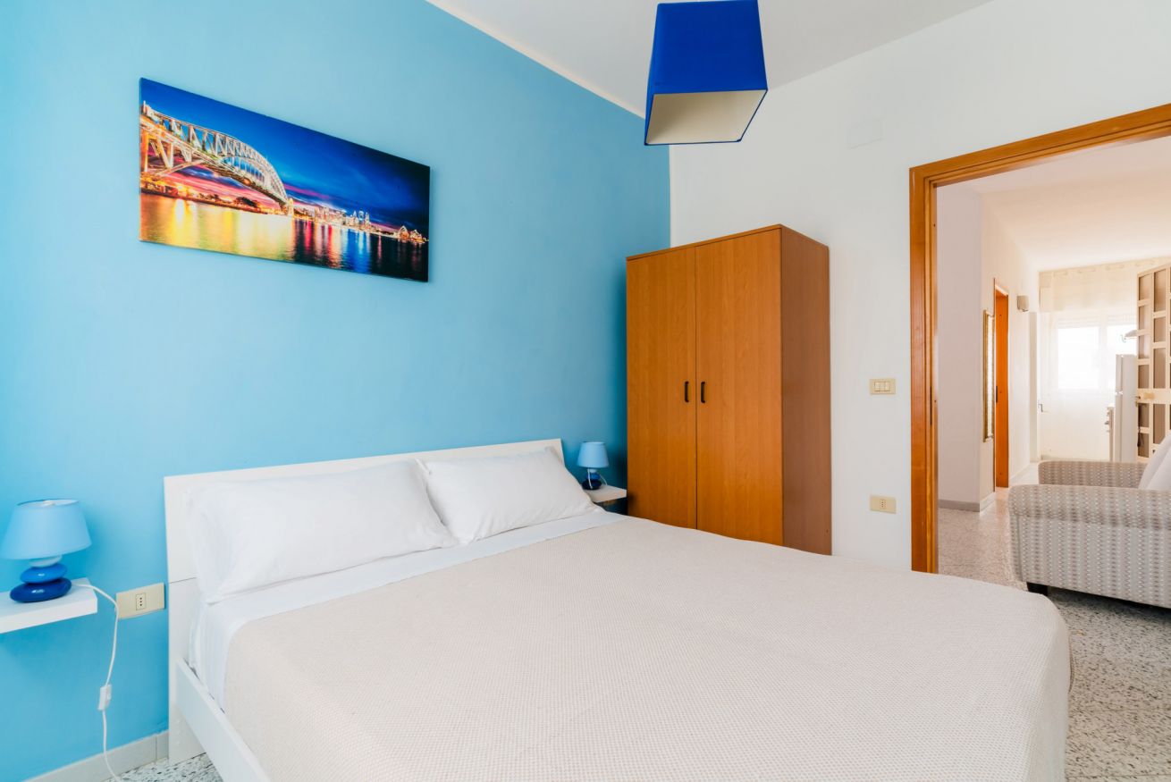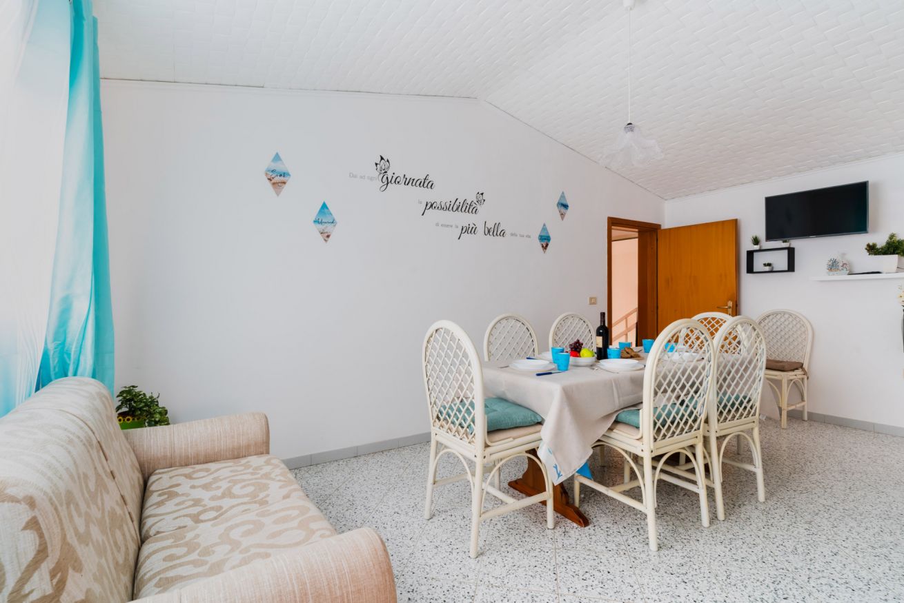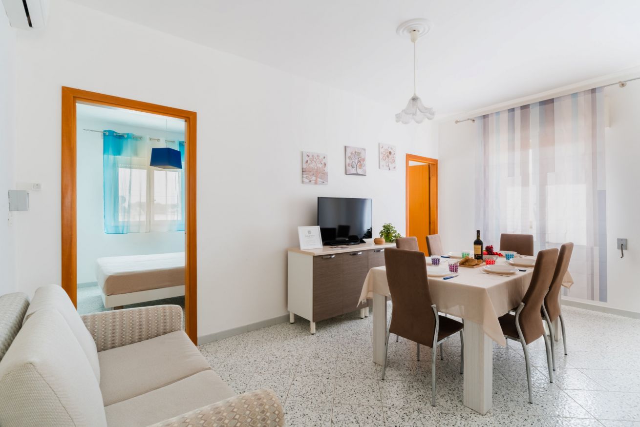 Casa Vacanza Gabry 1° Piano, situata a Torre Lapillo, ideale per famiglie o gruppi che cercano una soluzione pratica e funzionale a pochi passi dal mare salentino.Zona Giorno e CucinaL'ingresso si apre su un ampio open space climatizzato, arredato con semplicità e gusto moderno.Soggiorno: Dispone di un comodo divano lineare, una TV a schermo piatto e un grande tavolo da pranzo perfetto per cene conviviali. Spicca sulla parete un originale orologio di design a muro.Cucina: La cucina è separata o parzialmente a vista, dotata di mobili in legno chiaro, fuochi a gas, forno elettrico e un frigorifero con congelatore. È completamente attrezzata per preparare i pasti in autonomia.Lavanderia: È presente un pratico vano tecnico con un grande lavatoio, molto utile per sciacquare costumi e teli mare al rientro dalla spiaggia.Zona NotteLa casa dispone di diverse camere da letto, ognuna caratterizzata da un tema cromatico differente:Camera Matrimoniale "Pink": Caratterizzata da un'ampia testiera in ferro battuto bianco e una decorazione floreale a parete dai toni rosa e lilla.Camera Matrimoniale "Blue": Una stanza luminosa con una parete d'accento azzurro intenso e arredi coordinati, che richiama i colori del mare.Camera Doppia: Arredata con due letti singoli, ideale per bambini o ragazzi, completa di armadio e comodino centrale.Il BagnoIl bagno è funzionale e presenta finiture classiche, dotato di:Box doccia angolare con cabina a soffietto.Sanitari completi (incluso bidet).Mobile lavabo moderno con cassetti e specchiera illuminata.