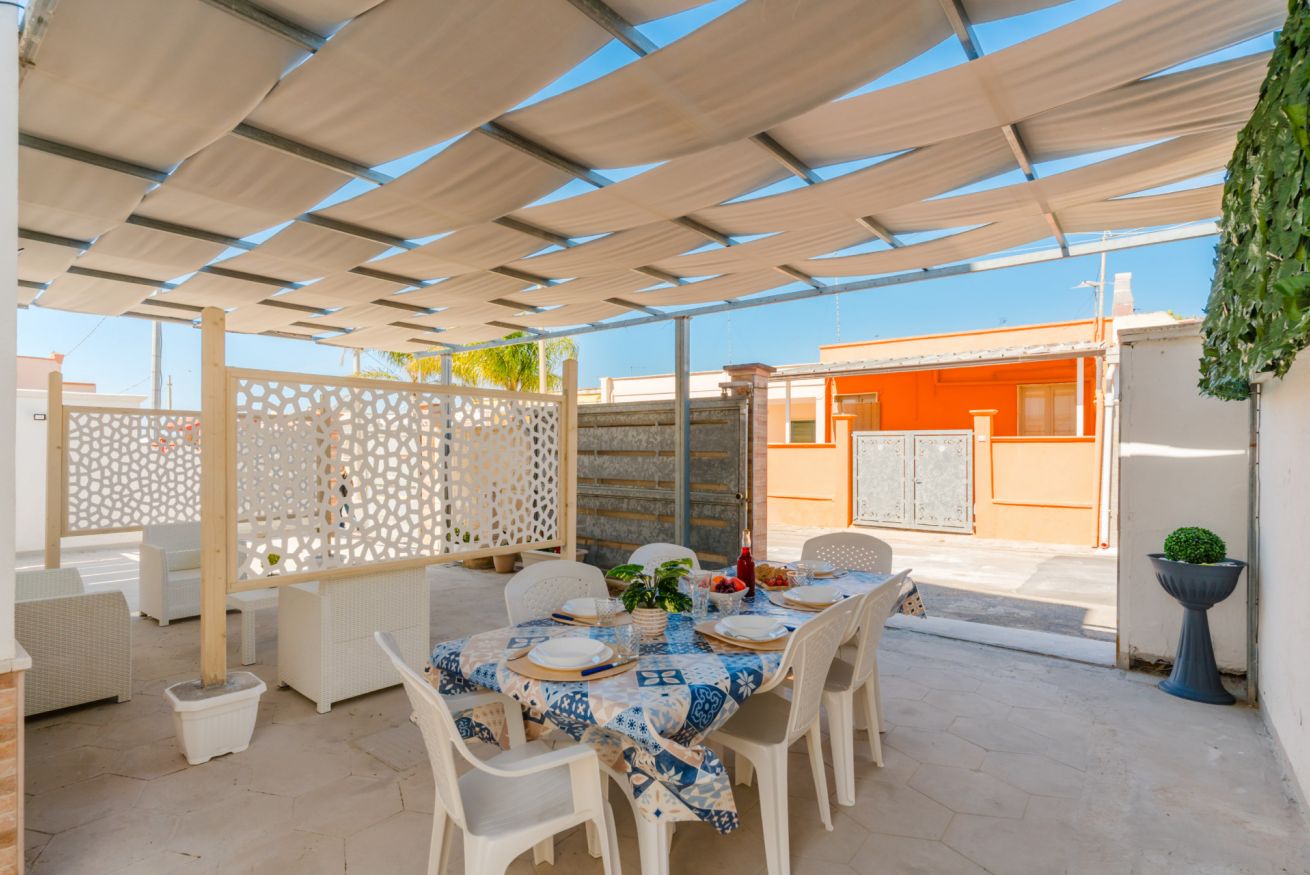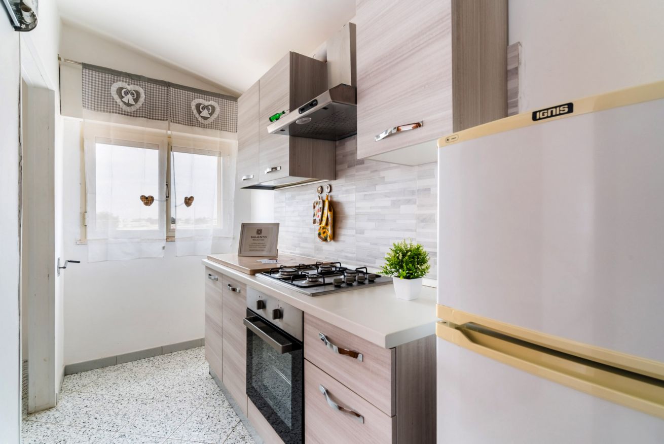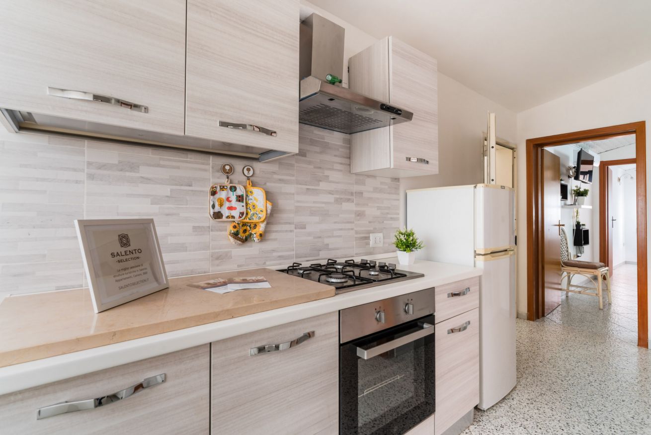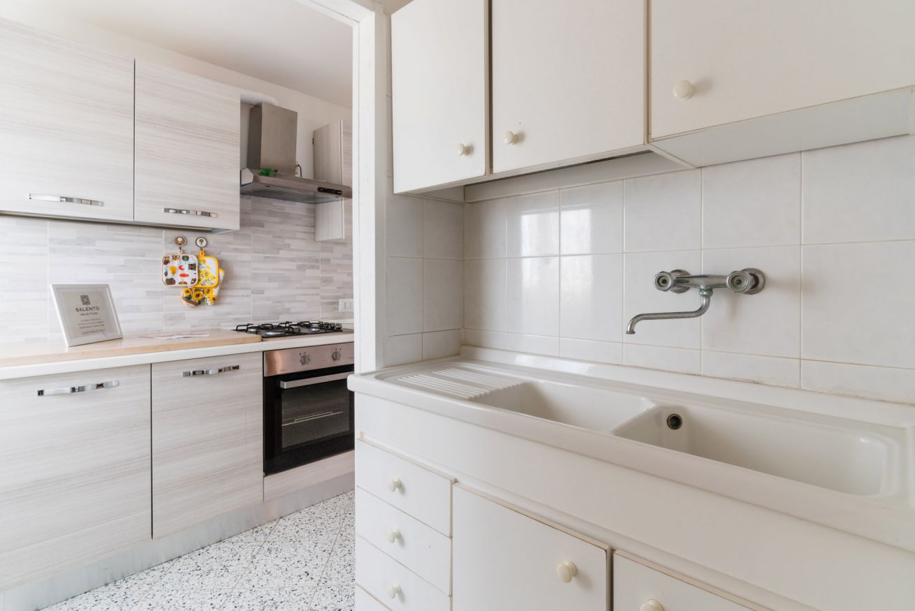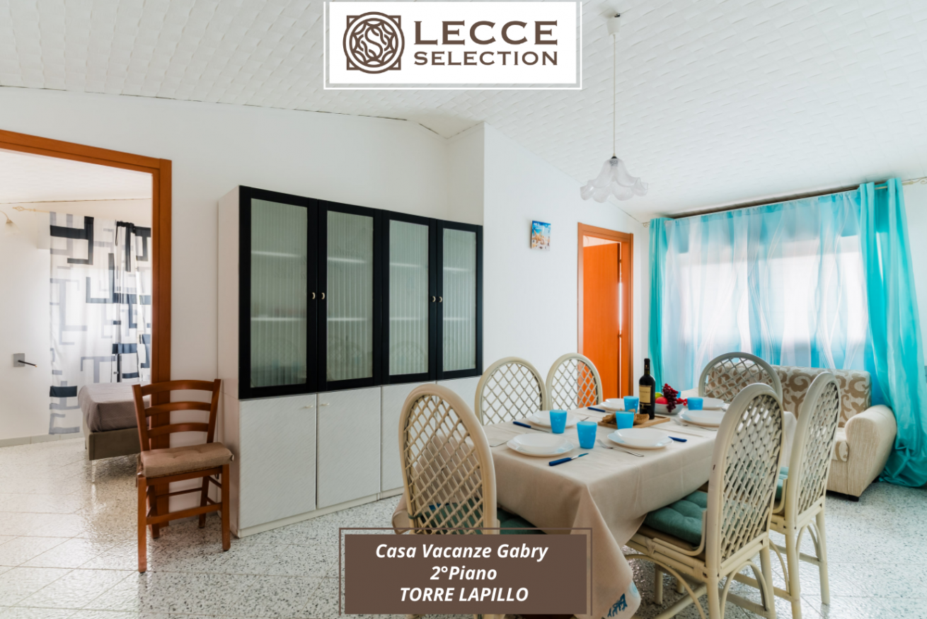 Casa Vacanza Gabry 2° Piano, situata a Torre Lapillo, ideale per famiglie o gruppi che cercano una soluzione pratica e funzionale a pochi passi dal mare salentino.Zona Giorno e CucinaL'ingresso si apre su un ampio open space climatizzato, arredato con semplicità e gusto moderno.Soggiorno: Dispone di un comodo divano lineare, una TV a schermo piatto e un grande tavolo da pranzo perfetto per cene conviviali.Cucina: La cucina è separata o parzialmente a vista, dotata di mobili in legno chiaro, fuochi a gas, forno elettrico e un frigorifero con congelatore. È completamente attrezzata per preparare i pasti in autonomia.Lavanderia: È presente un pratico vano tecnico con un grande lavatoio, molto utile per sciacquare costumi e teli mare al rientro dalla spiaggia.Zona NotteLa casa dispone di diverse camere da letto:Camera Matrimoniale: Caratterizzata da un'ampia testiera in ferro battuto.Camera con letto alla francesce: caratterizzata da un letto con testiera imbottita color grigio tortora, comodini bianchi in stile classico-moderno e un capiente armadio a due ante scorrevoli.Camera Doppia: Arredata con due letti singoli, ideale per bambini o ragazzi, completa di armadio e comodino centrale.Il BagnoIl bagno è funzionale e presenta finiture classiche, dotato di:Box doccia angolare con cabina a soffietto.Sanitari completi (incluso bidet).Mobile lavabo moderno con cassetti e specchiera illuminata.
