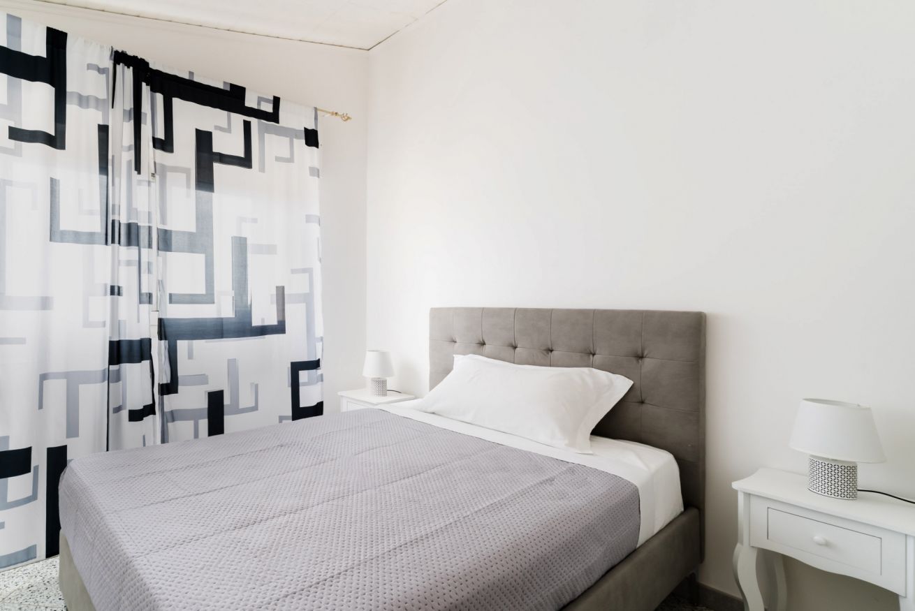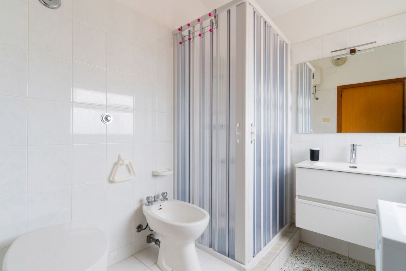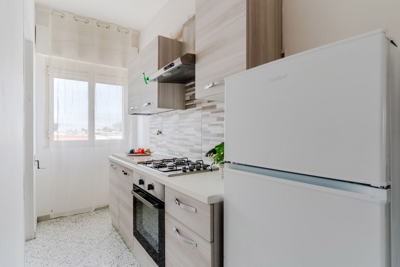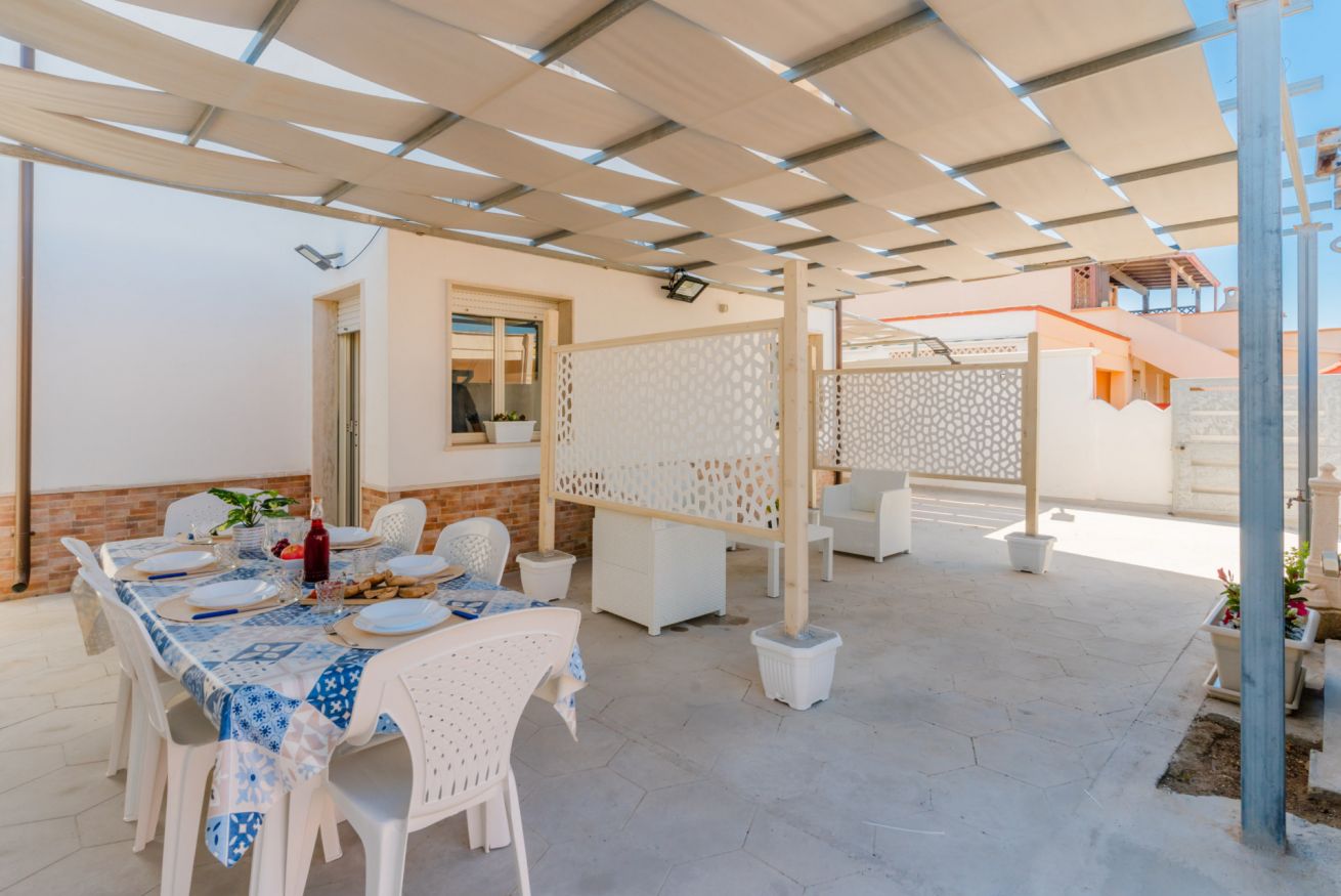 Casa Vacanza Gabry 2° Piano, situata a Torre Lapillo, ideale per famiglie o gruppi che cercano una soluzione pratica e funzionale a pochi passi dal mare salentino.Zona Giorno e CucinaL'ingresso si apre su un ampio open space climatizzato, arredato con semplicità e gusto moderno.Soggiorno: Dispone di un comodo divano lineare, una TV a schermo piatto e un grande tavolo da pranzo perfetto per cene conviviali.Cucina: La cucina è separata o parzialmente a vista, dotata di mobili in legno chiaro, fuochi a gas, forno elettrico e un frigorifero con congelatore. È completamente attrezzata per preparare i pasti in autonomia.Lavanderia: È presente un pratico vano tecnico con un grande lavatoio, molto utile per sciacquare costumi e teli mare al rientro dalla spiaggia.Zona NotteLa casa dispone di diverse camere da letto:Camera Matrimoniale: Caratterizzata da un'ampia testiera in ferro battuto.Camera con letto alla francesce: caratterizzata da un letto con testiera imbottita color grigio tortora, comodini bianchi in stile classico-moderno e un capiente armadio a due ante scorrevoli.Camera Doppia: Arredata con due letti singoli, ideale per bambini o ragazzi, completa di armadio e comodino centrale.Il BagnoIl bagno è funzionale e presenta finiture classiche, dotato di:Box doccia angolare con cabina a soffietto.Sanitari completi (incluso bidet).Mobile lavabo moderno con cassetti e specchiera illuminata.