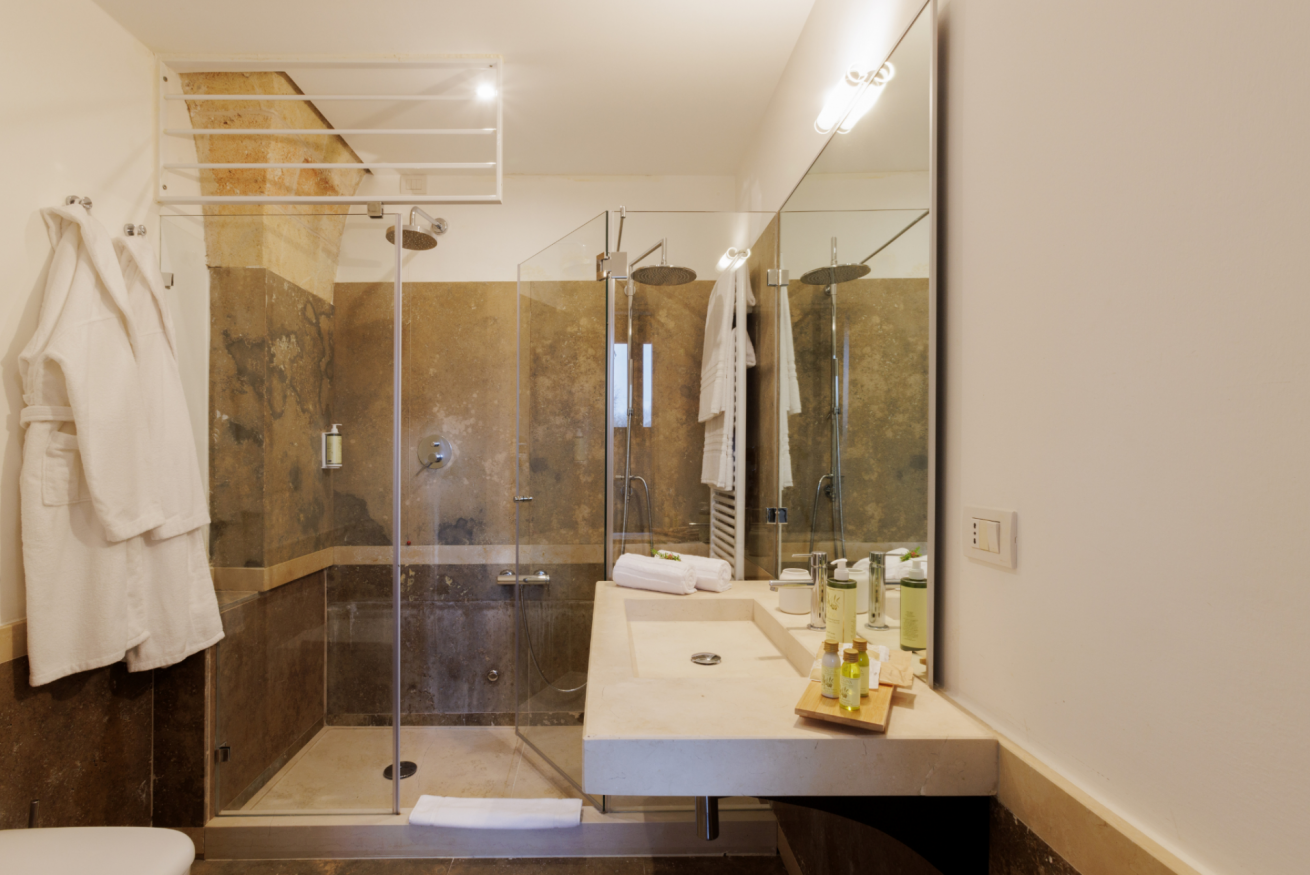 Materiali naturali, pietra a vista, colori caldi e profumi mediterranei creano un’atmosfera intima e confortevole.